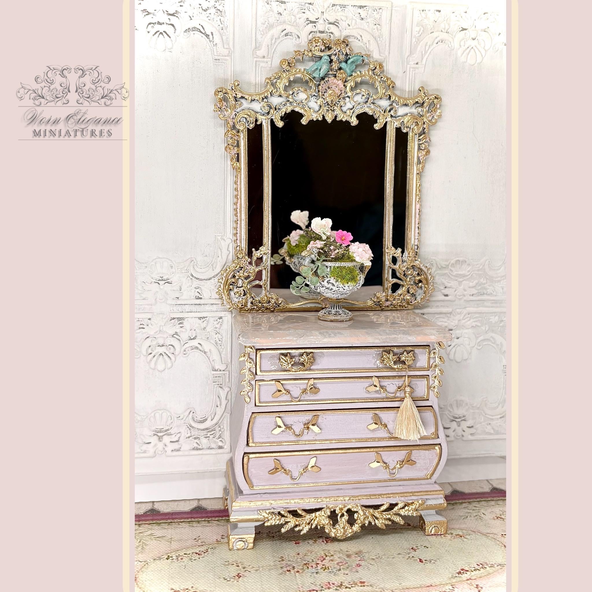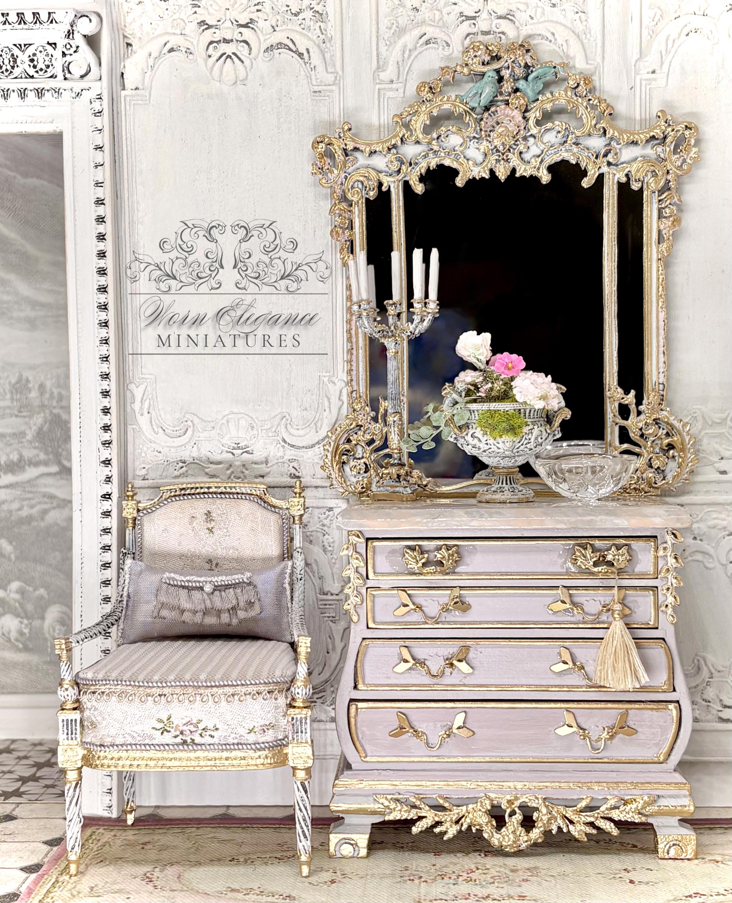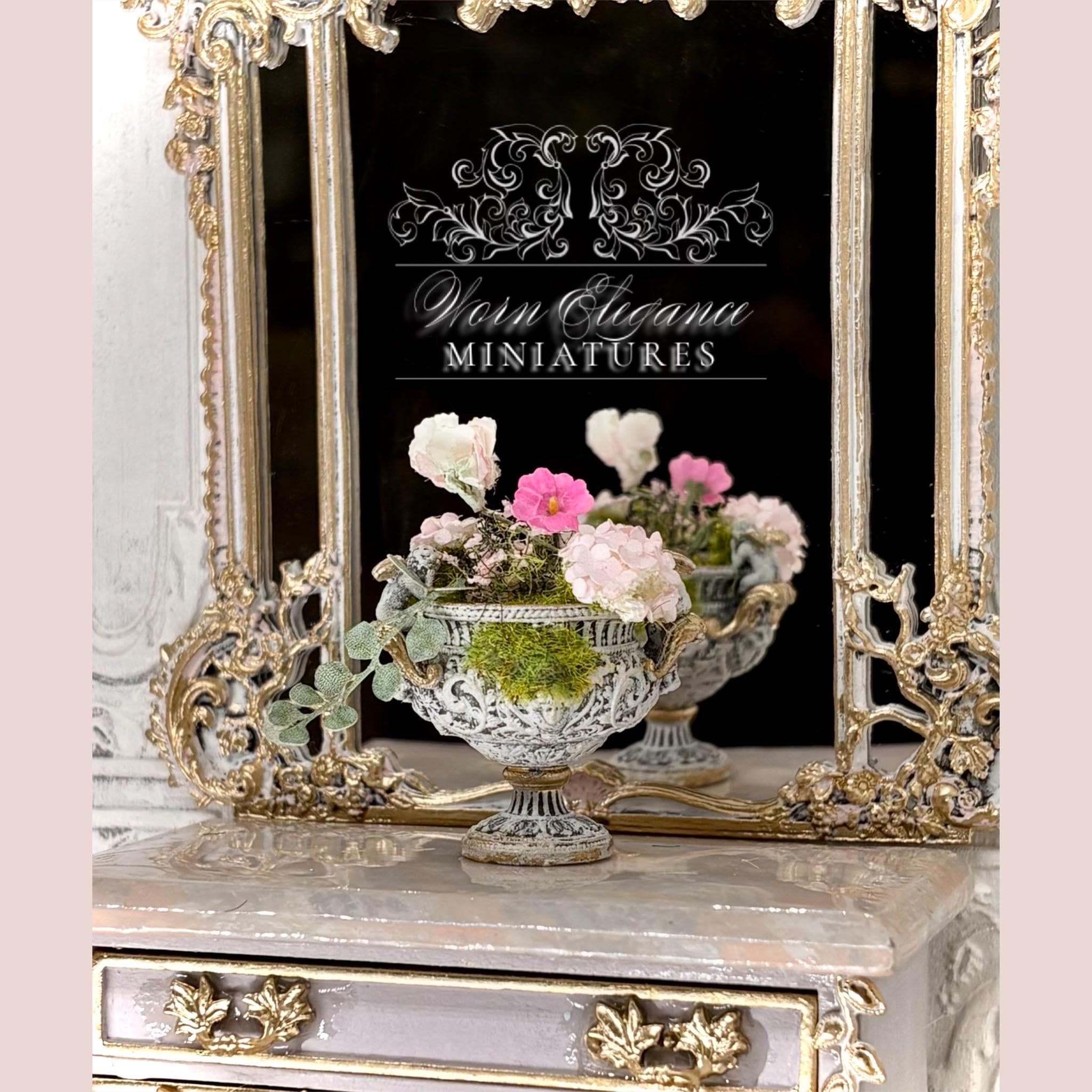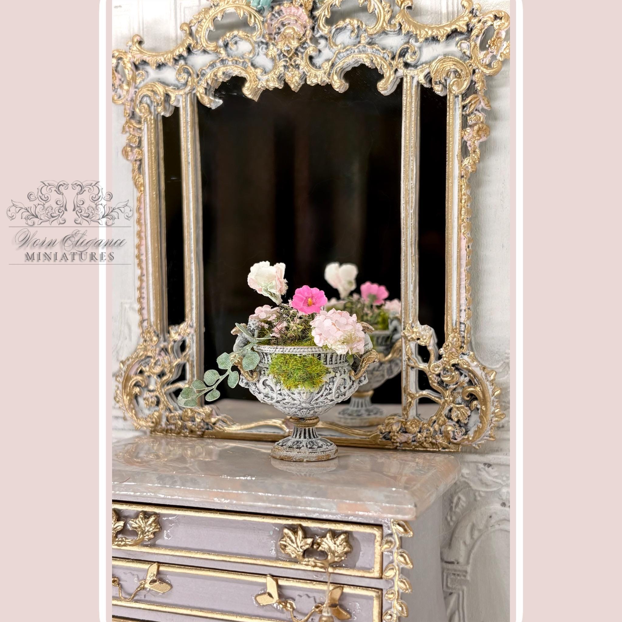 Dollhouse Miniature Floral Arrangement in Carved French Urn Planter, 1:12, Artisan, Flowers, Greenery, Lightly Gilded, OOAK, Elegant Decor
