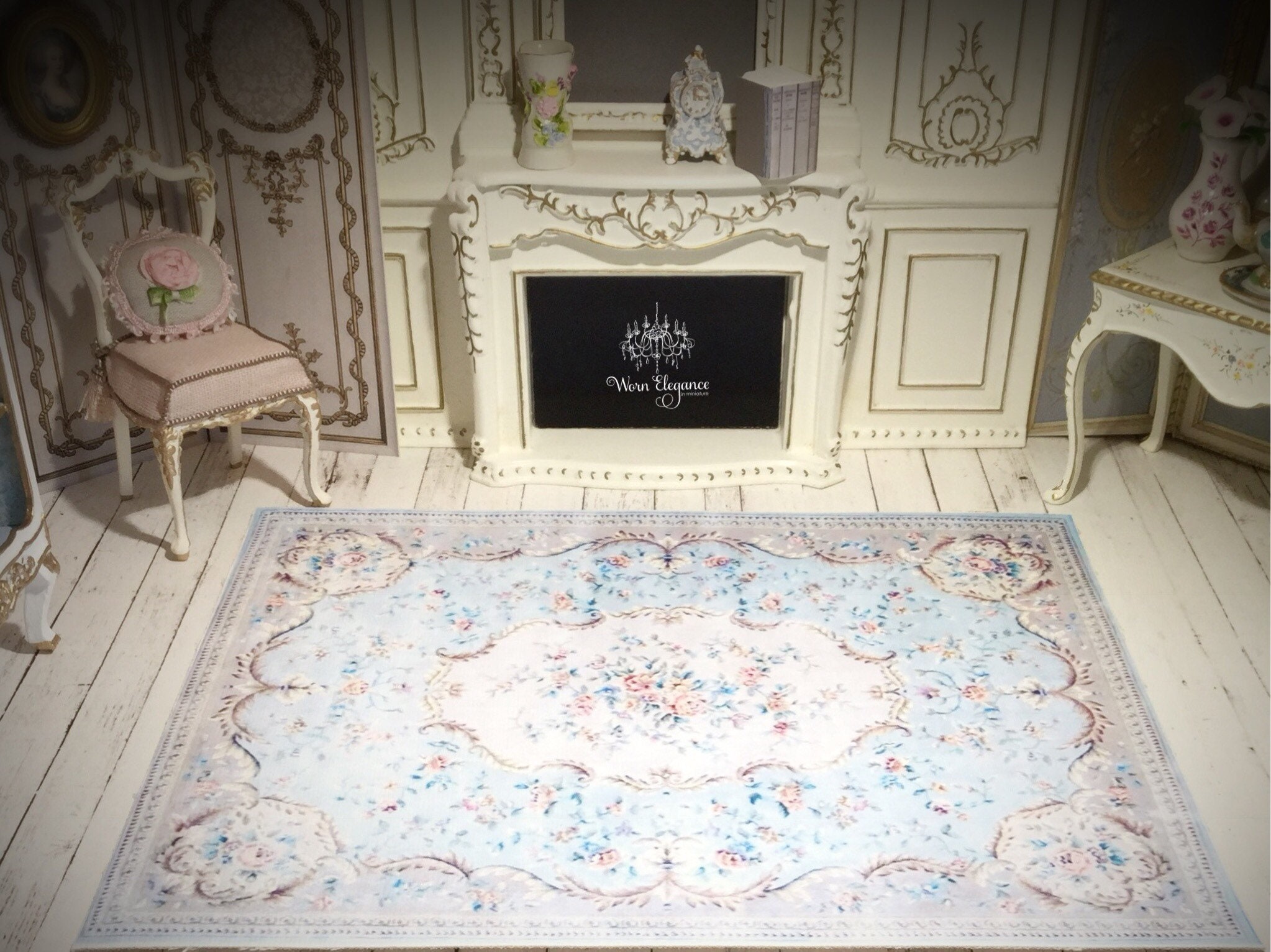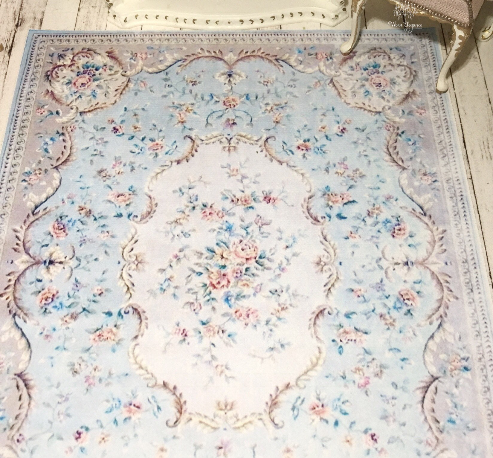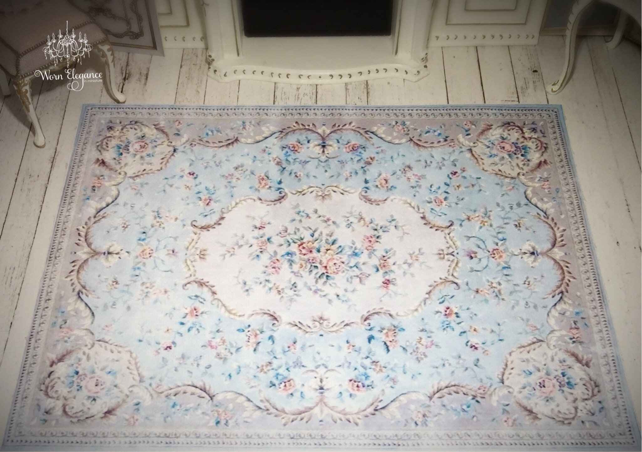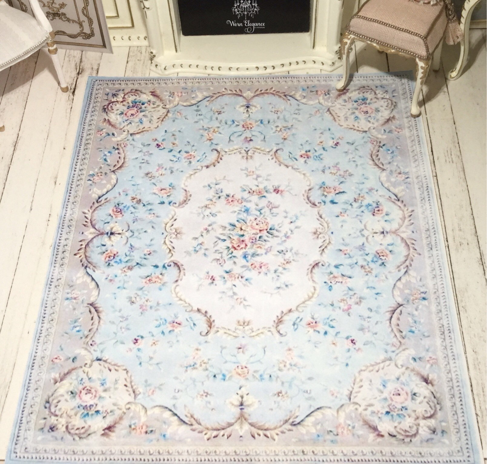 Dollhouse Aubusson Rug #43, 1:12, French Style, Rug, Floor Covering, Carpet, Antique Reproduction, Louis Blues, Pale Blues, Florals
