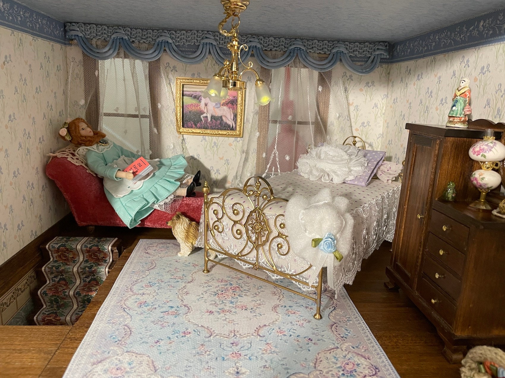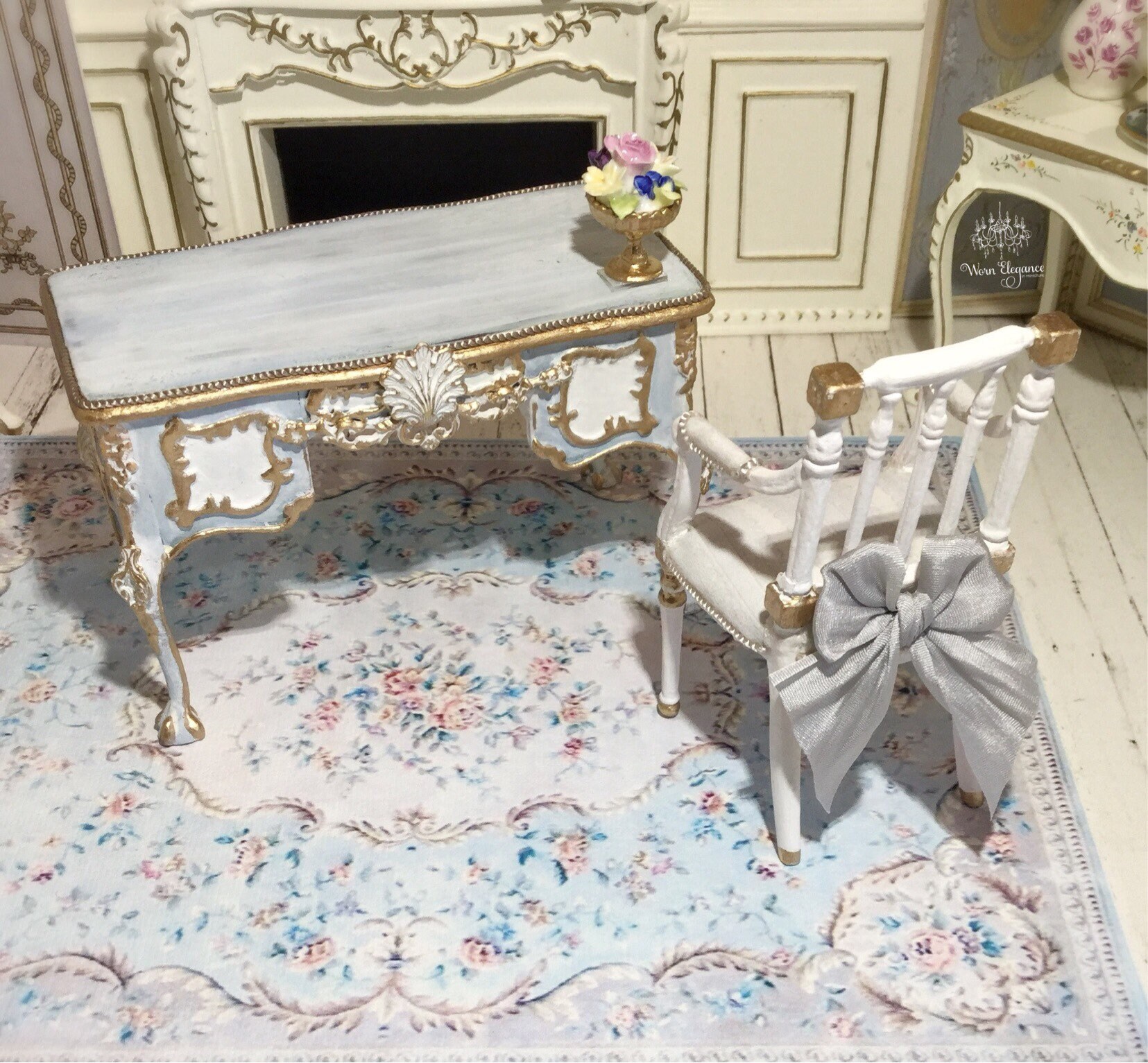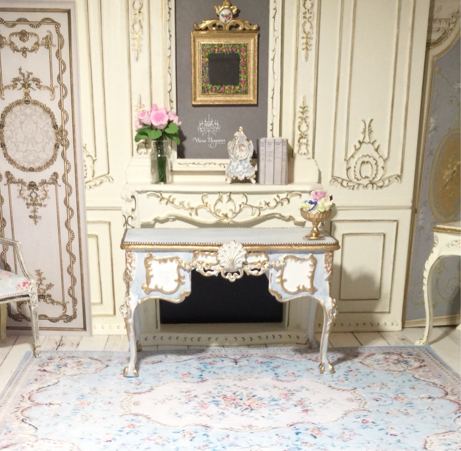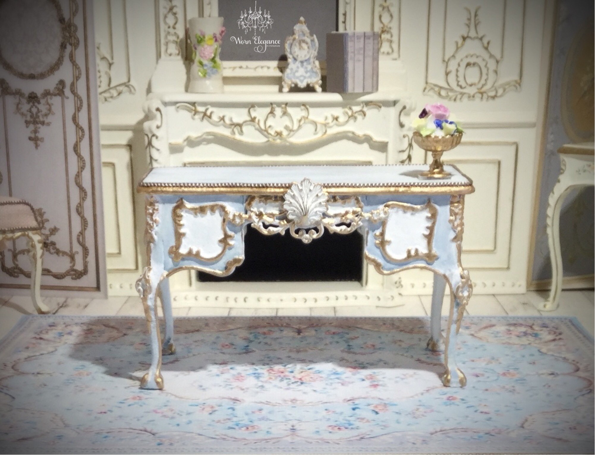 Dollhouse Aubusson Rug #43, 1:12, French Style, Rug, Floor Covering, Carpet, Antique Reproduction, Louis Blues, Pale Blues, Florals
