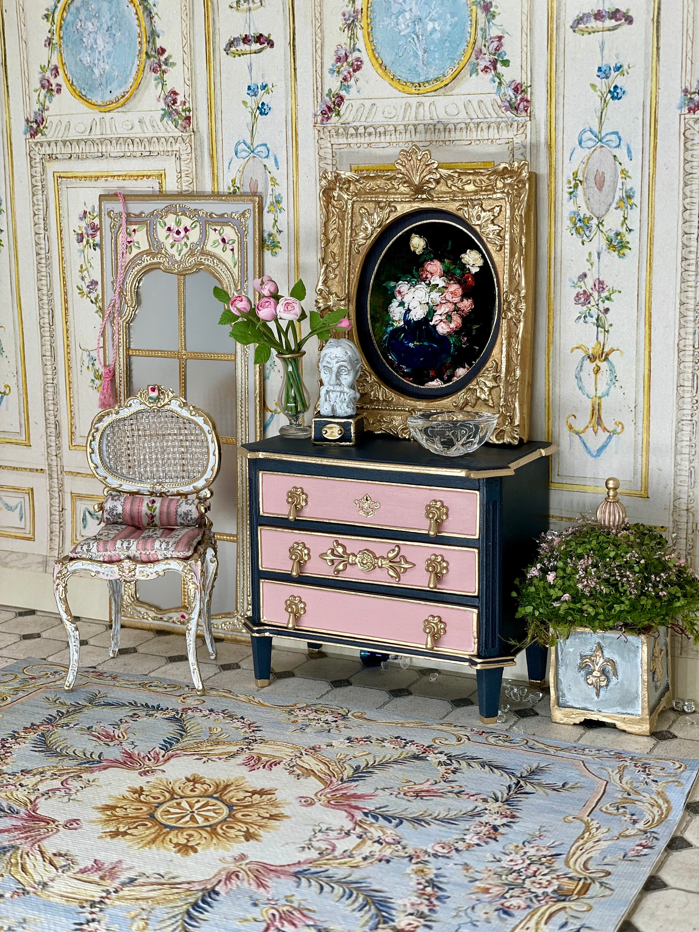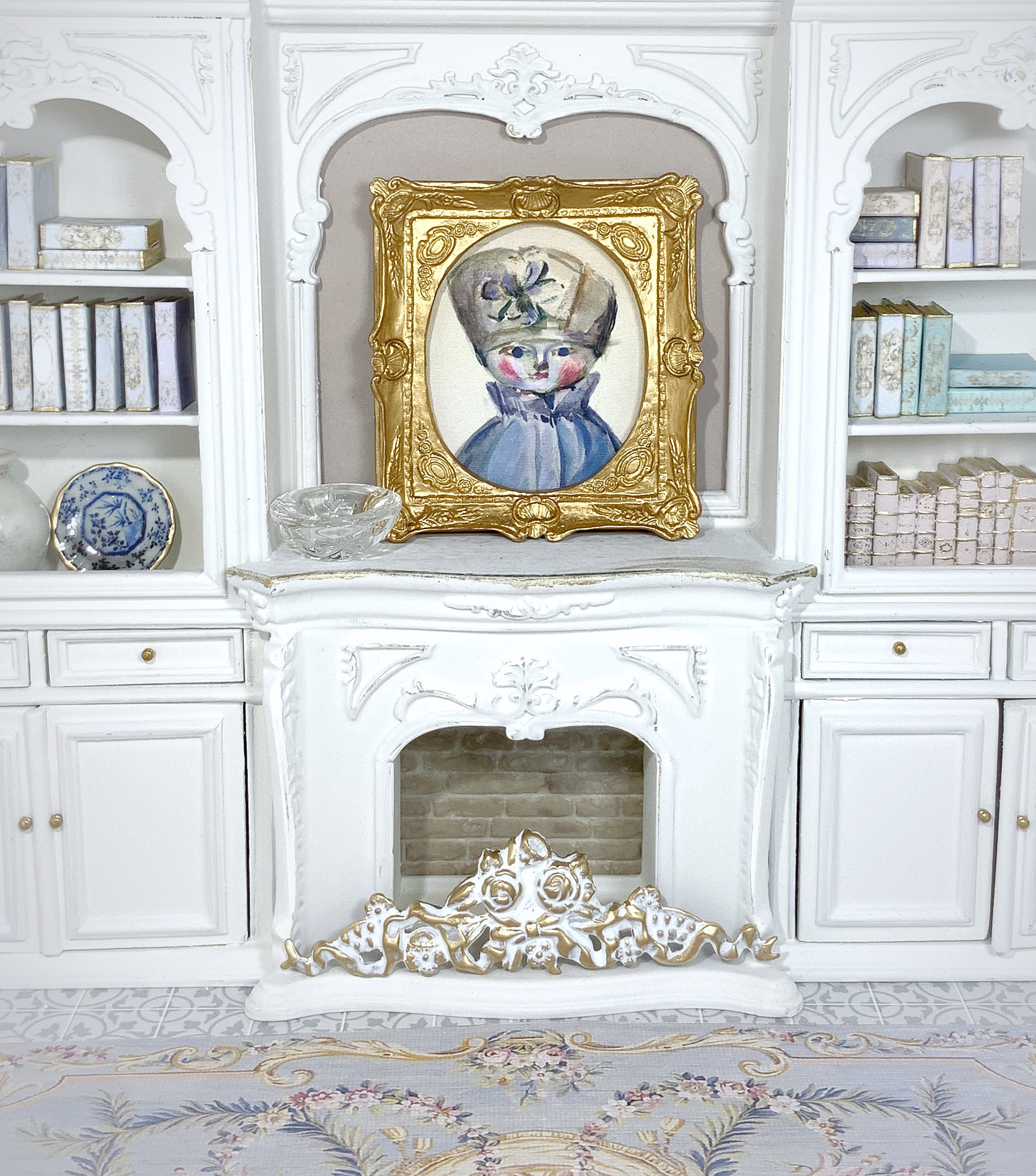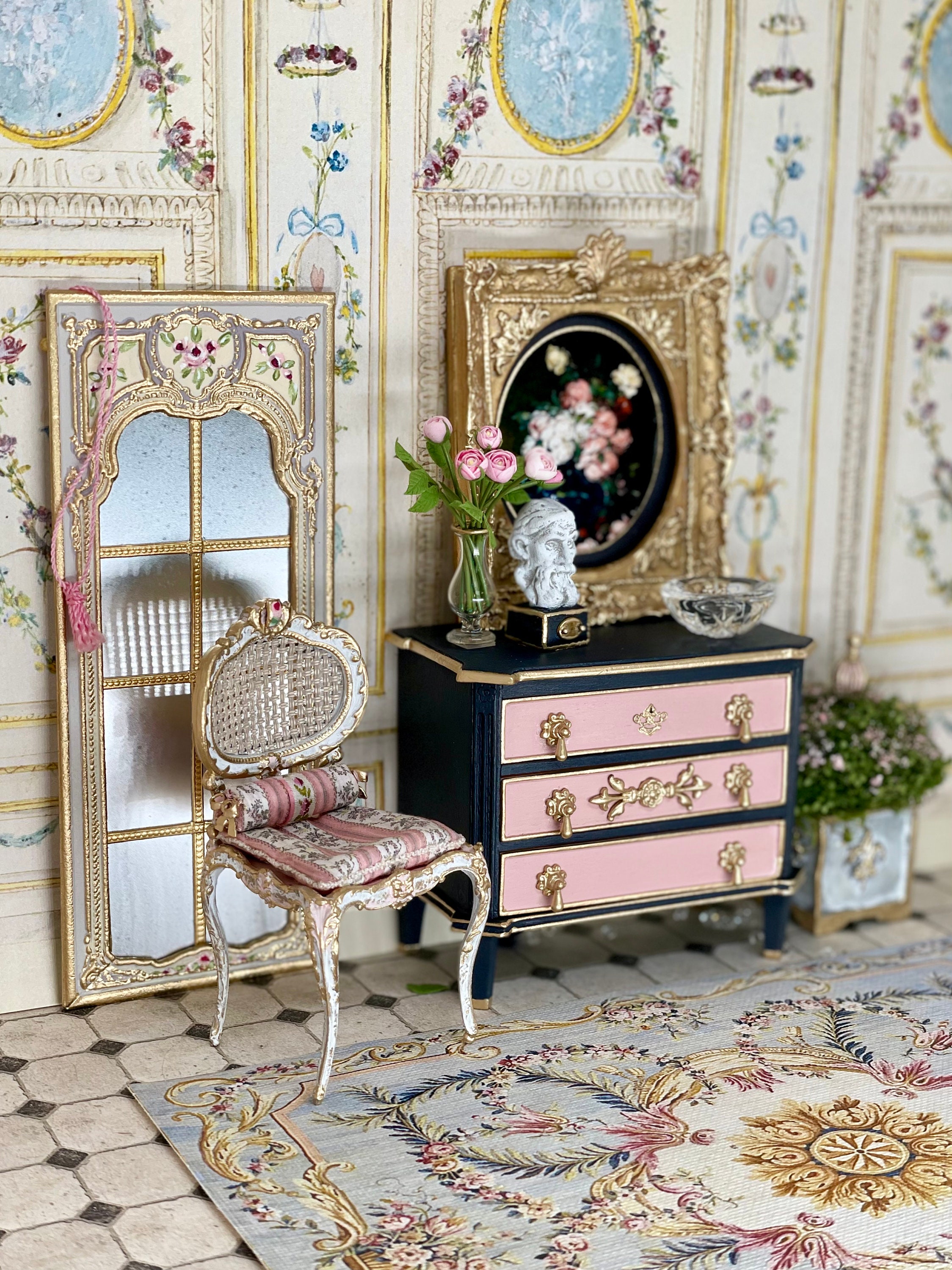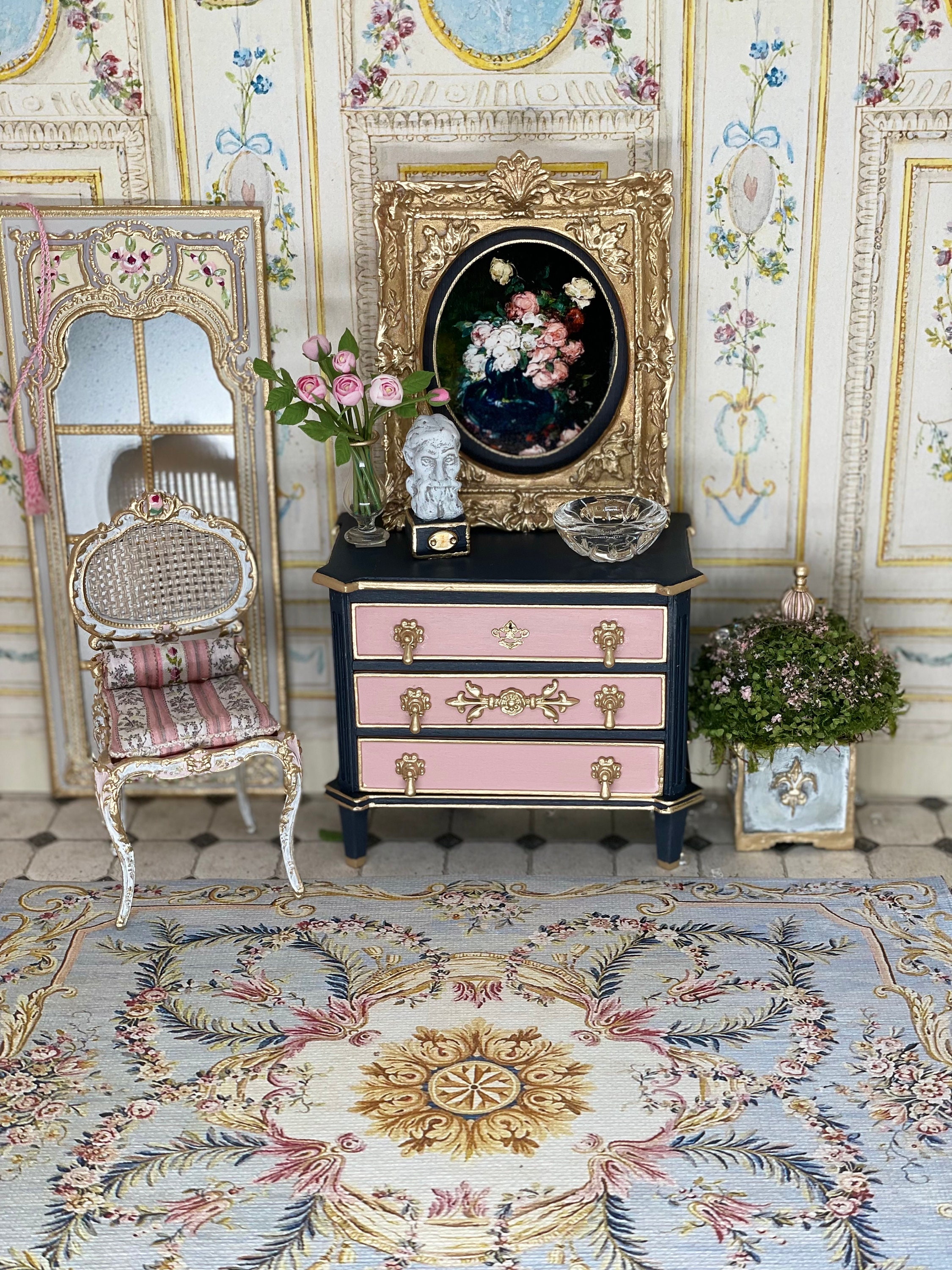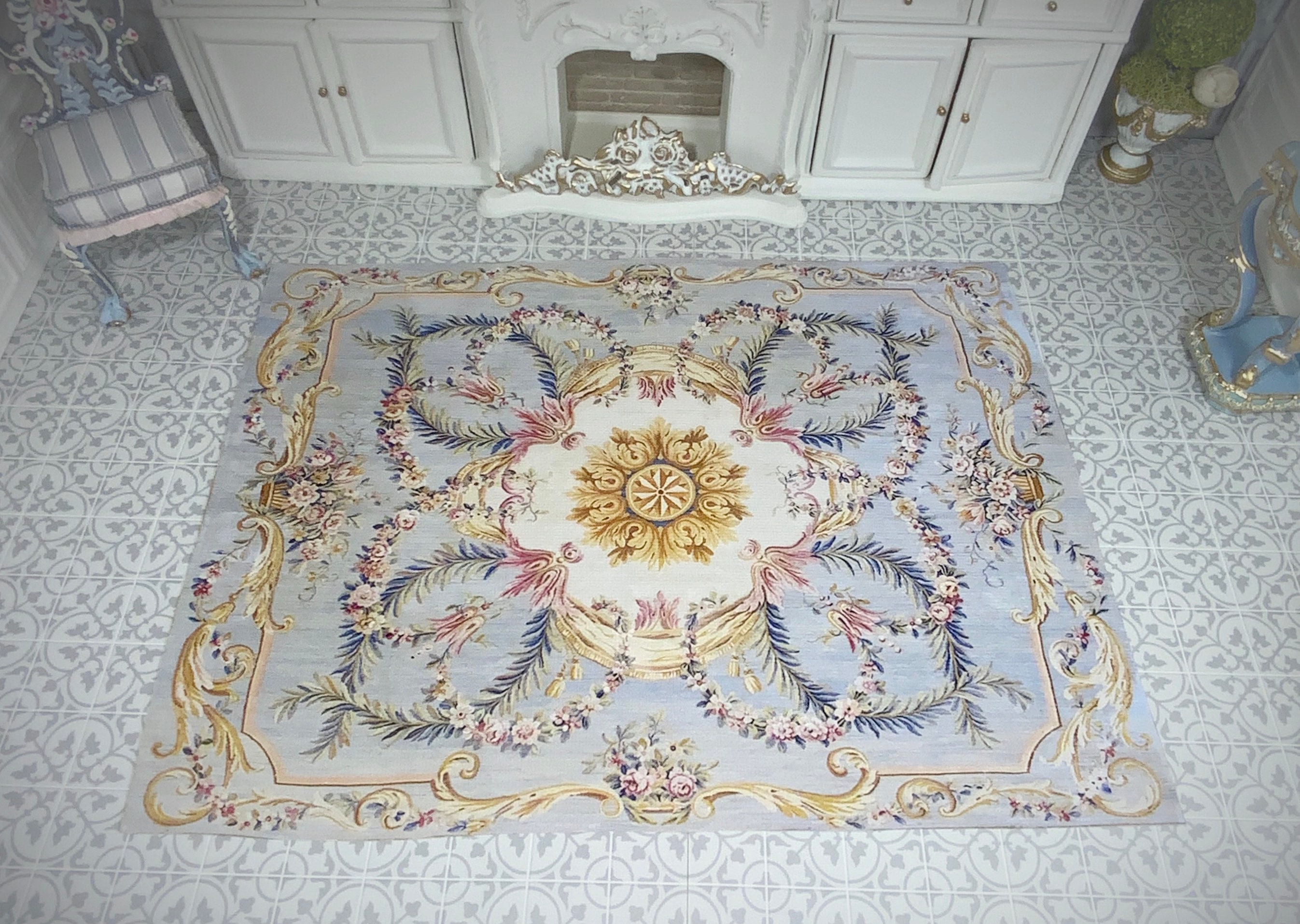 Dollhouse NEW Rug #31, 1:12, Antique Reproduction, Floor Covering, Hues of Blues, Pinks, Ivory, French Rug, Medallion, Floral Swags, Canvas