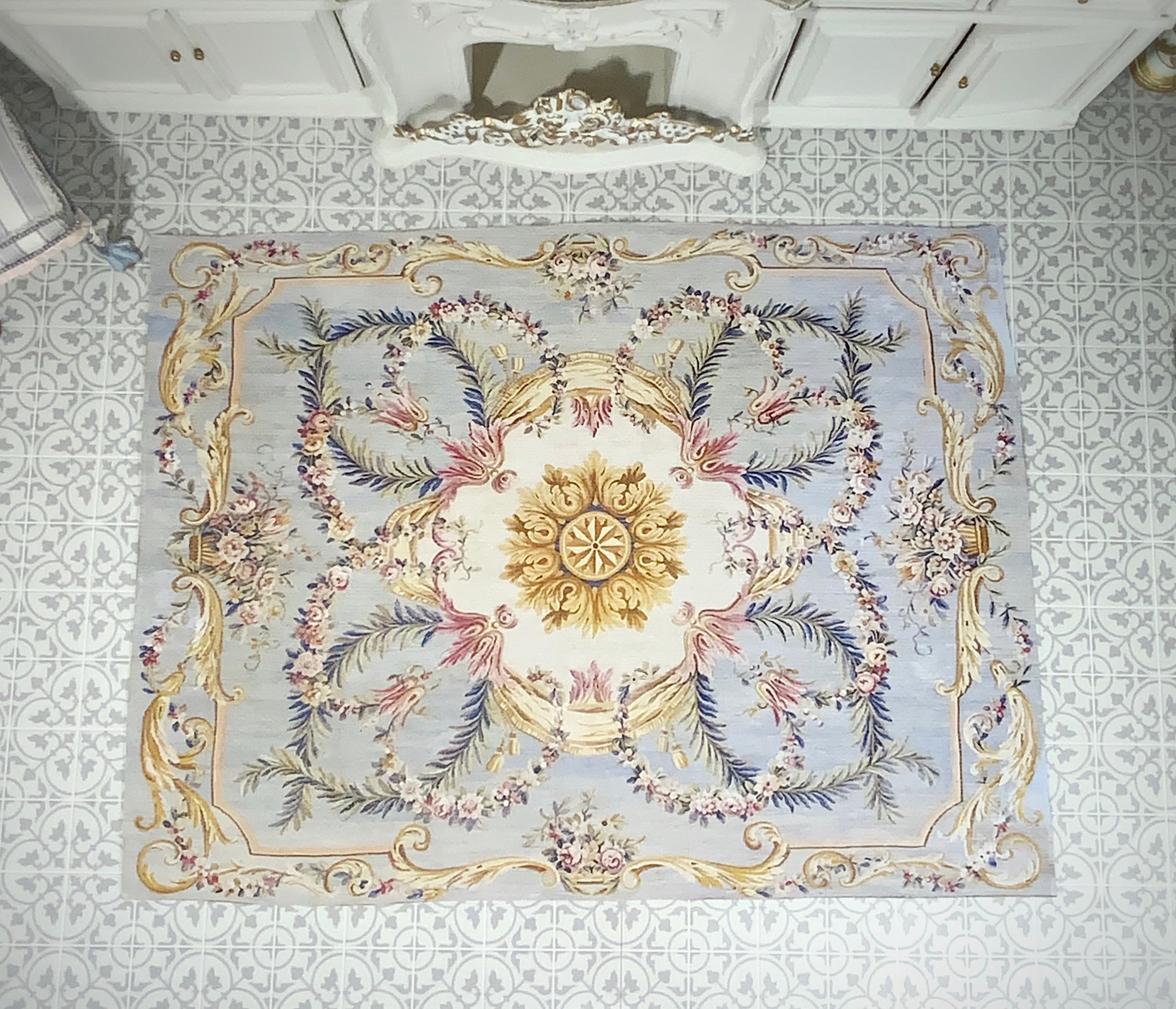 Stunning, antique French style, floor covering! Medallion center with swags, and swags of florals, flowering baskets... and, all things Late 18th century, French inspired!